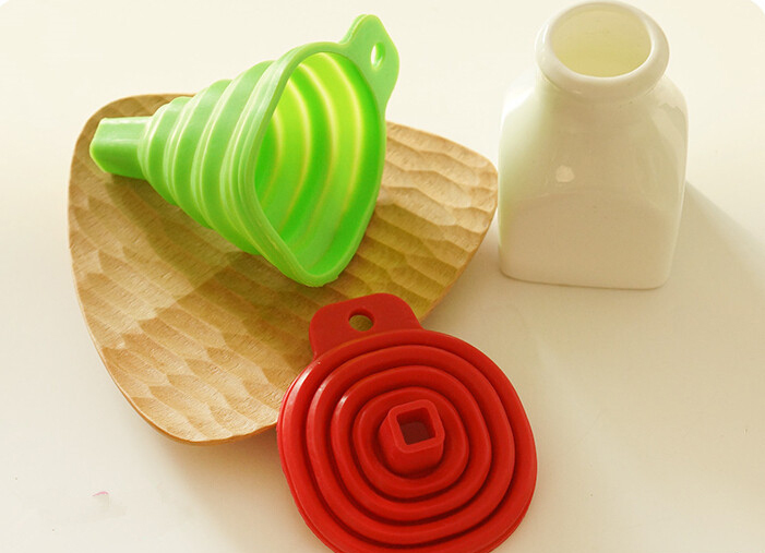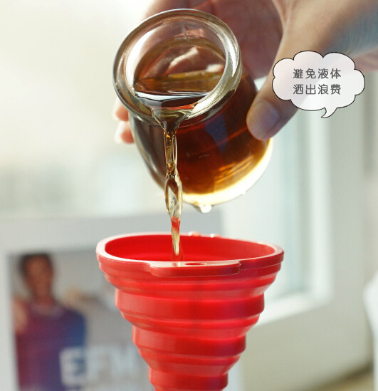 1、创意硅胶折叠漏斗,用于厨房内酱油、料酒等的灌装,食品级硅胶材质,持久耐用