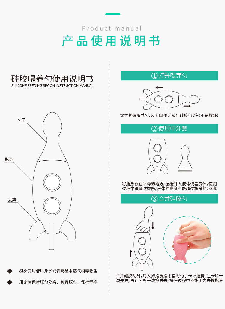 1、碗勺一体,轻松喂养,挤压式设计,解放双手,解决喂养烦恼